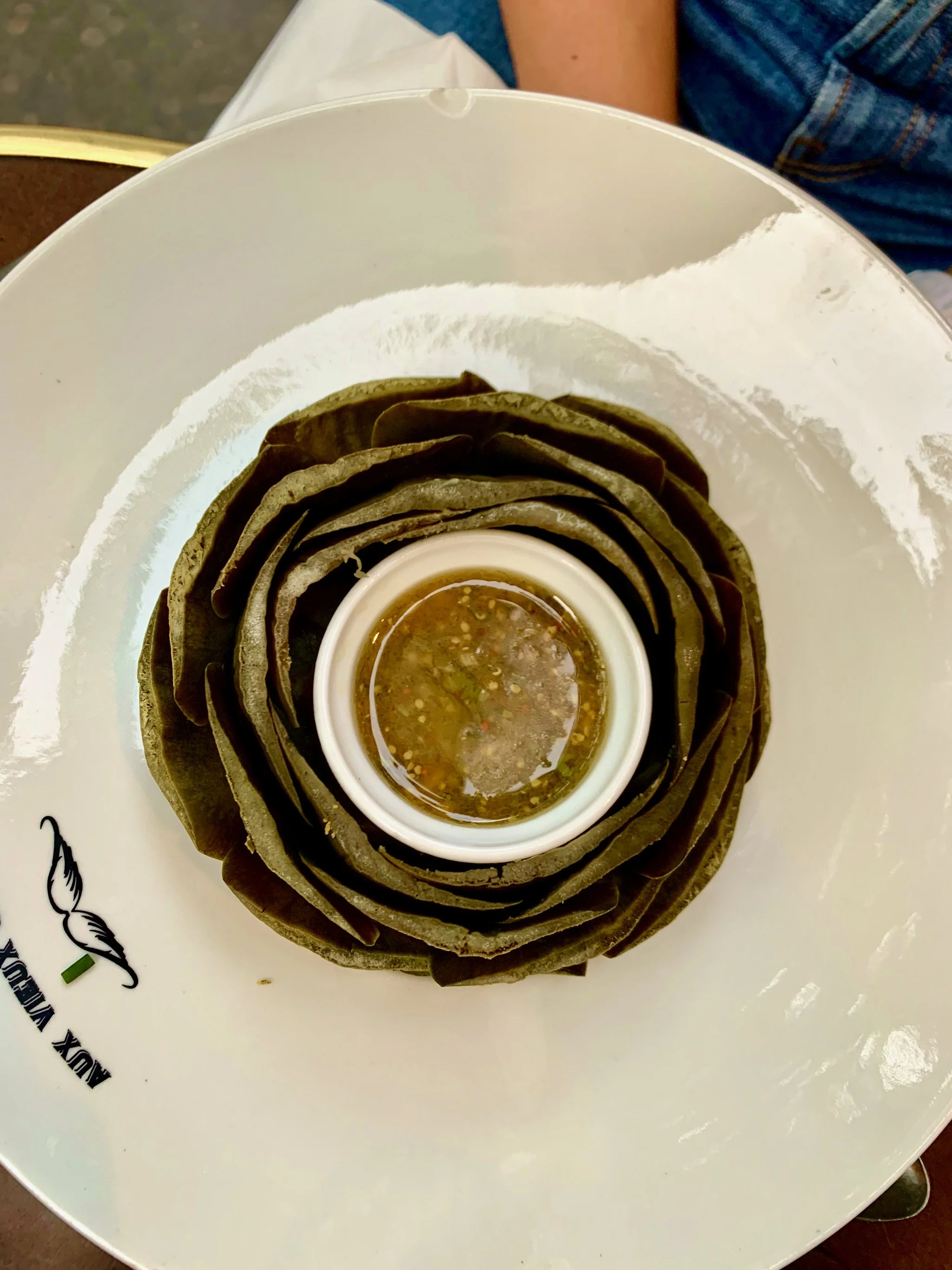 Food: The menu was shown to us on a tall chalkboard resting on some chairs near our table. It had some of my favorite, standby French dishes on the menu: oeuf mayonnaise, carpaccio, artichokes, roasted meats, and steak au poivre. Yum yum yum.